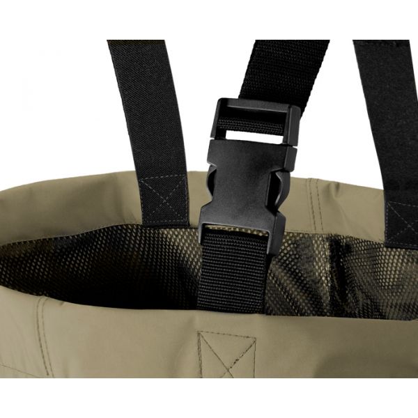 Prsačky HRON jsou vysoce spolehlivým modelem z dílny značky Delphin. Vyznačují se výbornými vlastnostmi a velmi kvalitním provedením. Každý detail je zpracován dokonale precizně. Moderní materiál zaručuje naprostou voděodolnost a zároveň pohodlné nošení díky nízké hmotnosti. Navíc uvnitř prsaček se nachází všitá síťka, která snižuje přímý dotyk kůže a vodotěsného materiálu, a tím výrazně omezuje pocení. Obrovským bonusem který je nevídaný v této kategorii je neoprenová výztuha kolen, což umožňuje například i velmi komfortní klečení ve vodě. Kromě standardních nastavitelných popruhů na ramena, disponuje tento model také vyjímatelným páskem, což umožní ještě lepší přizpůsobení postavě rybáře. Gumové holínky s odolnou a stabilní podrážkou vás podrží i v náročnějších podmínkách. Samozřejmostí jsou také výčnělky v oblasti paty pro snadnější vyzouvání. Složení: taslon / PVC