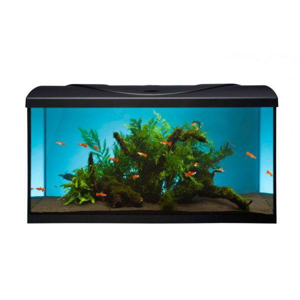Set akvária s rovnou přední skleněnou stěnou, šířkou 80 cm a objemem 112 l dodávaný s osvětlením, filtrem, topítko, síťkou a vzorky suchého krmiva. Více detailů