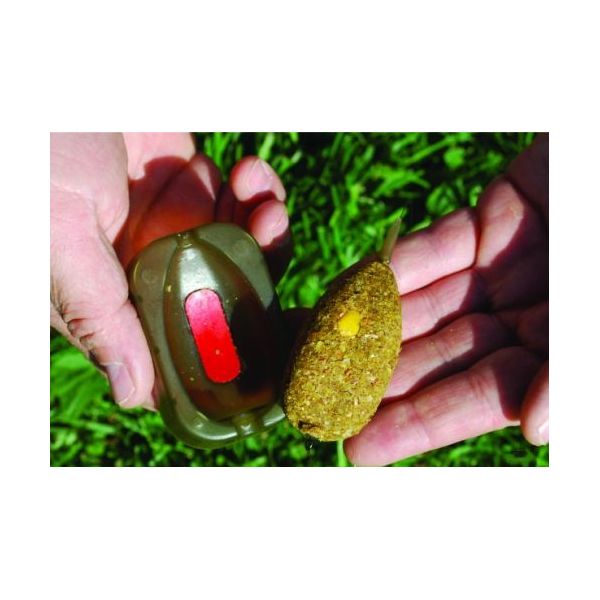 Průběžné plastové krmítko vhodné pro lov na feeder nebo na lehkou kaprařinu. Jeho vynikajícími vlastnostmi jsou: aerodynamický tvar s namáčknutou směsí pro daleké náhozy, plochý tvar se zátěží po celé délce pro lepší fixaci na dně (oceníte hlavně na řece).Krmítko je primárně určeno k použití v průběžné sestavě. Avšak za pomocí malého bročku či gumičku se může zafixovat a tím nám vznikne buď pevná nebo poloprůbežná montáž.