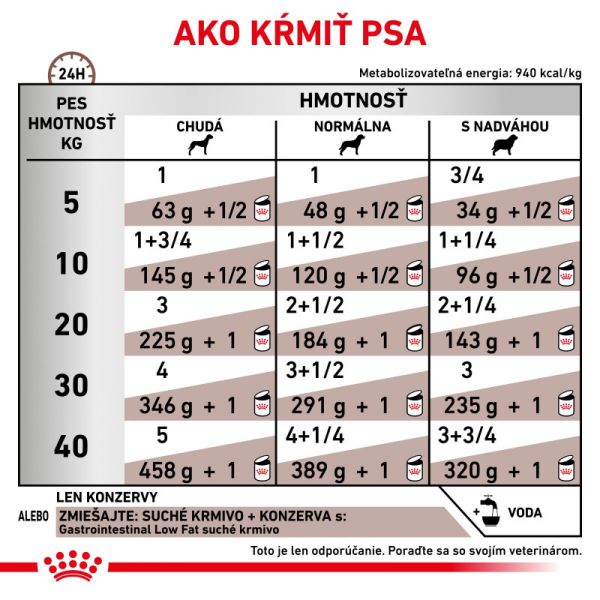 Dospělí psi s digestivními problémy mohou trpět nadváhou v případě poruch vstřebávání lipidů či jiných látek. Naše veterinární dieta v podobě konzervované stravy je vrátí zpátky do života. Je ideální například při akutní a chronické pankreatitidě, hyperlipidemii, lymfagiektázii nebo gastritidě.
