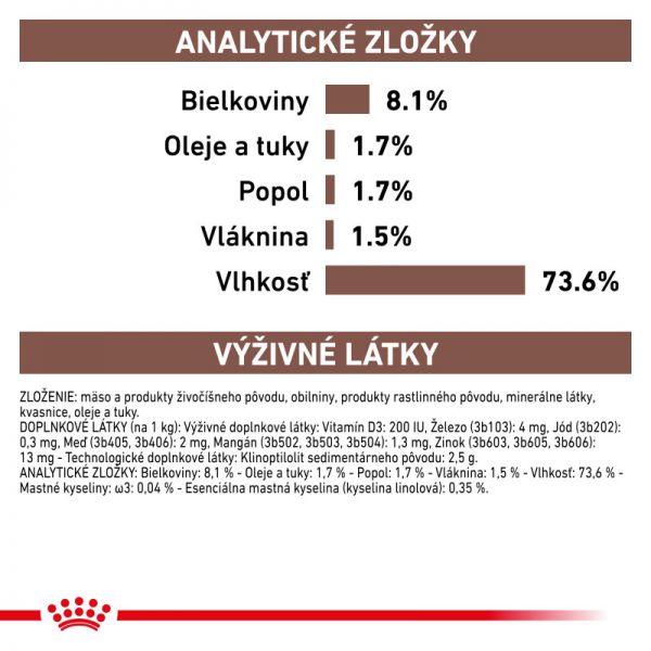 ANALYTICKÉ SLOŽKY: Protein: 8,0 % - Hrubá vláknina: 1,4 % - Obsah tuku: 1,7 % - Hrubý popel: 1,9 % - Vlhkost: 74,0 % - Sodík (Na): 0,16 % - Draslík (K): 0,16 % - Omega-3 mastné kyseliny: 0,05 % - EPA/DHA: 0,03 %.