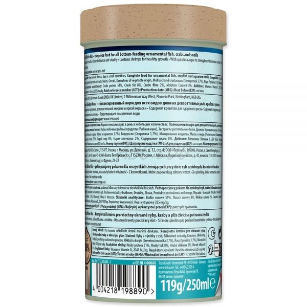 Zelené tablety jsou s vysokým obsahem řasy spirulina, která je nejlepší potravou pro býložravce žijící na dně. Hnědé tablety jsou nejvhodnější pro masožravce. Tablety mají přesně vyvážené složení, takže se ve vodě pozvolna rozpouštějí. Tyto ryby a raci si obvykle svou potravu šetří, takže toto krmení plně odpovídá jejich požadavkům a voda nebude zakalená.