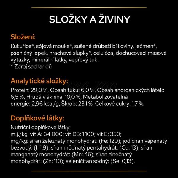 Složení: kukuřice*, sójová mouka*, sušené drůbeží bílkoviny, ječmen*, pšeničný lepek, hrachové slupky*, celulóza, aromatická přísada, minerální látky, vepřový tuk *zdroje sacharidů.