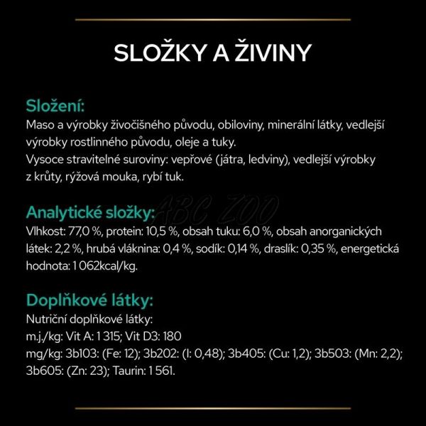 Vysoce stravitelné krmné složky: Vepřové maso (játra, ledviny), vedlejší produkty z krůtího masa, rýžová mouka, rybí tuk
