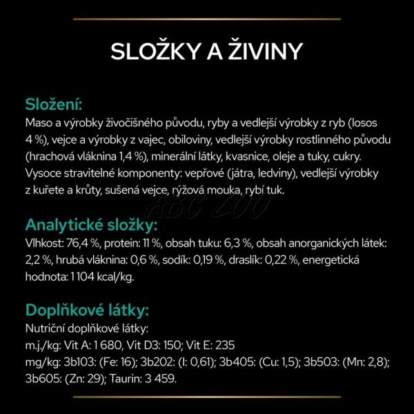 Složení: maso a vedlejší výrobky živočišného původu, ryby a vedlejší výrobky z ryb (4 % losos), vejce a vedlejší výrobky z vajec, obiloviny, minerální látky, vedlejší výrobky rostlinného původu (hrachová vláknina 1,4 %), oleje a tuky, kvasnice, cukry