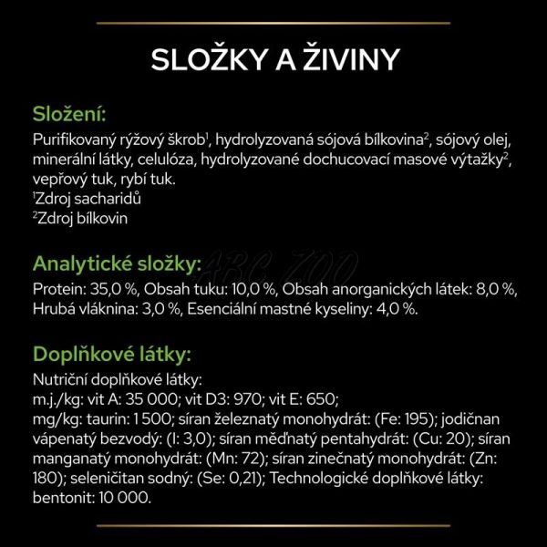 Složení: čištěný rýžový škrob, hydrolyzovaná sójová bílkovina, sójový olej, minerální látky, celulóza, hydrolyzovaná aromatická přísada, vepřový tuk, rybí tuk
