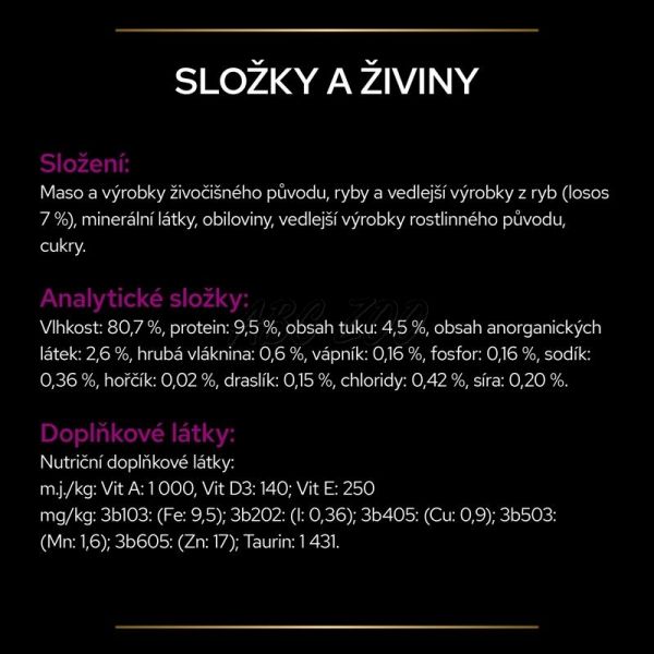 Složení: Maso a vedlejší výrobky živočišného původu, ryby a vedlejší výrobky z ryb (7 % losos), minerální látky, obiloviny, vedlejší výrobky rostlinného původu, cukry