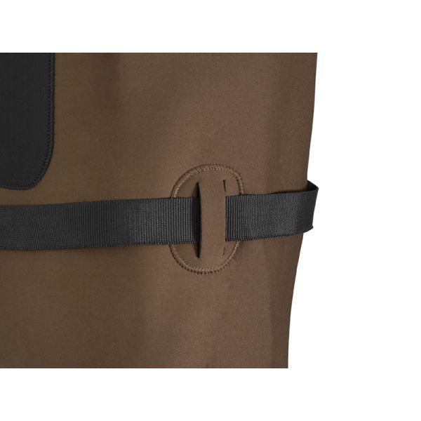 Při zimním rybaření je třeba myslet hlavně na tepelný komfort. Ten dokážou ideálním způsobem zajistit neoprenové prsačky Delphin ORAVA. Vyznačují se kvalitním provedením a elegantním designem. Každé prošití a namáhané spoje jsou precizně ošetřeny, aby zabránily nechtěnému prosakování. Hnědá barva neoprenu zamezí vzniku velkého množství viditelných skvrn ze slizu a dalších různých nečistot. Neodmyslitelným pomocníkem je neoprenová kapsa na přední straně prsaček, kde si můžete odložit například povolení k rybolovu. Nemusíte se bát ani kleknutí na zem, protože v kolenní části jsou prsačky zpevněny dvojitou vrstvou neoprenu. Nastavitelné popruhy na ramena jsou také vybaveny neoprenovou výstelkou, aby bylo nošení prsaček během celodenních vycházek pohodlné a ramena méně namáhána. Pod šlemi se také nacházejí dva plastové kroužky, na které lze pomocí joja, nebo karabiny uchytit různé pomůcky, jako například pean nebo metr. Součástí balení je i brodící pásek, který zamezí natečení vody do prsaček při nechtěném uklouznutí nebo pádu. Pryžové kozačky s odolnou a stabilní podrážkou vás podrží i v náročnějších podmínkách. Jejich vnitřek je vystlán neoprenovou vložkou, která chrání nohy před chladem.