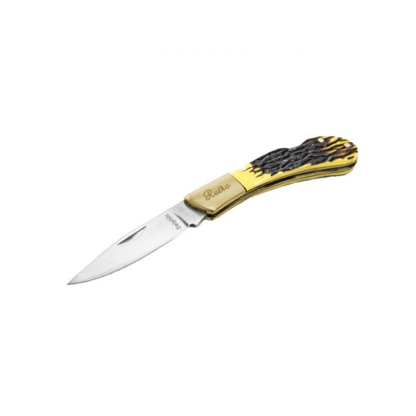 Pamatujete si na jeden z vašich prvních nožů? Možná vypadal přesně takto. RETRO je malý zavírací nůž, který najde své uplatnění při jednoduché přípravě jídla na rybách, v kempu či na horách. Rukojeť je tvořena kombinací kovu a imitací parohu. Tlačná pojistka zajišťuje bezpečnost při práci. RETRO je skvělým nožíkem na opékání, nebo jako záložní nůž na ryby a na túry.