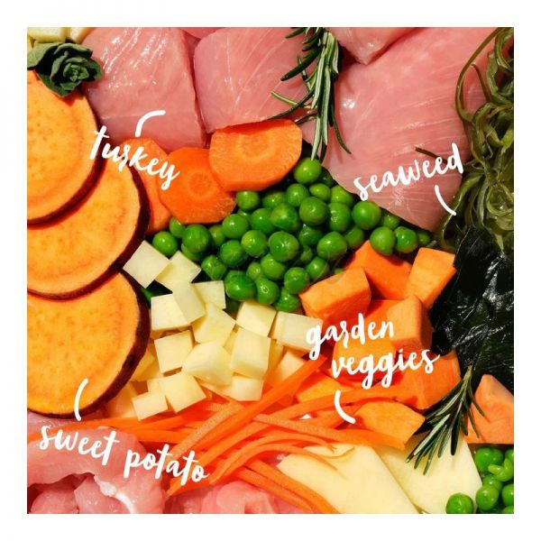 Složení: Krocaní maso 60 % (33 % čerstvě připravené krůtí maso z volného chovu, 23 % sušené krůtí maso, 4 % šťáva z krůtího masa), sladké brambory (14 %), brambory, hrášek (10 %), bramborová bílkovina, vojtěška, lososový olej (1 % ), minerální látky, kvasnicové produkty (1000 mg/kg), extrakt z kořene čekanky (fruktooligosacharidy 1000 mg/kg), mořské řasy, glukosamin (500 mg/kg), sušená mrkev (500 mg/kg), směs bylin (máta peprná, rozmarýn, oregano a tymián 500 mg/kg), beta glukany (300 mg/kg), chondroitin sulfát (150 mg/kg)