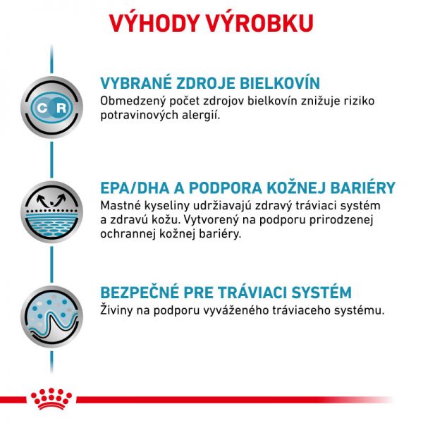 Projevují-li se u psa zažívací potíže, kožní erupce či zánětlivá onemocnění střev, mohou být projevem nežádoucí potravní reakce. Psům s alergickými reakcemi imunitního systému a eliminační dietou pomáhá veterinární dieta v podobě vlhké konzervované stravy řešit problémy s chronickým průjmem a atopickou dermatitidou.