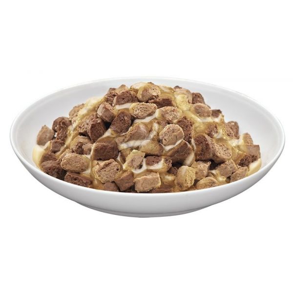 S JEHNĚČÍM A KRŮTÍM: maso a výrobky živočišného původu (4 % jehněčí, 4 % krůtí), ryby a vedlejší výrobky z ryb, vedlejší výrobky rostlinného původu (0,4% inulin), minerální látky. Krmivo neobsahuje barviva, konzervanty a přidané cukry.