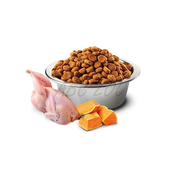 Složení: křepelka (24 %), sušená křepelčí bílkovina (22 %), sladké brambory, kuřecí tuk, sušená dýně (5 %), sušená vejce, sleď, sušená sleďová bílkovina, rybí tuk (ze sledě), hrachová vláknina, sušená mrkev, vojtěšková moučka, inulin, frukto-oligosacharidy, kvasničný extrakt (zdroj manno-oligosacharidů), sušená granátová jablka (0,5 %), sušená jablka, sušený špenát, psyllium (semena a slupky), sušené sladké pomeranče, sušené borůvky, chlorid sodný, sušené pivovarské kvasnice, kurkuma (0,2 %), extrakt z aloe vera, glukosamin, chondroitin sulfát.