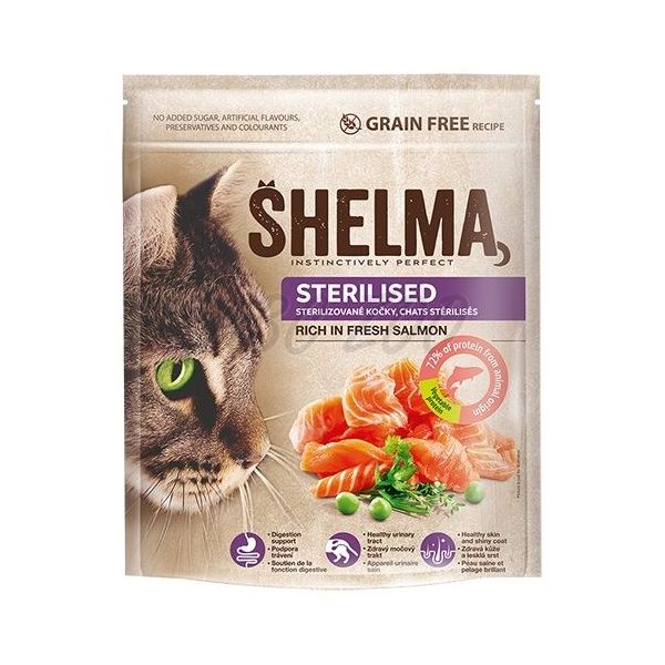 Kompletní krmivo pro sterilizované kočky bez obilovin, bohaté na čerstvé maso z lososa, se 72 % živočišných bílkovin, určené k podpoře optimální hmotnosti a celkového zdraví.