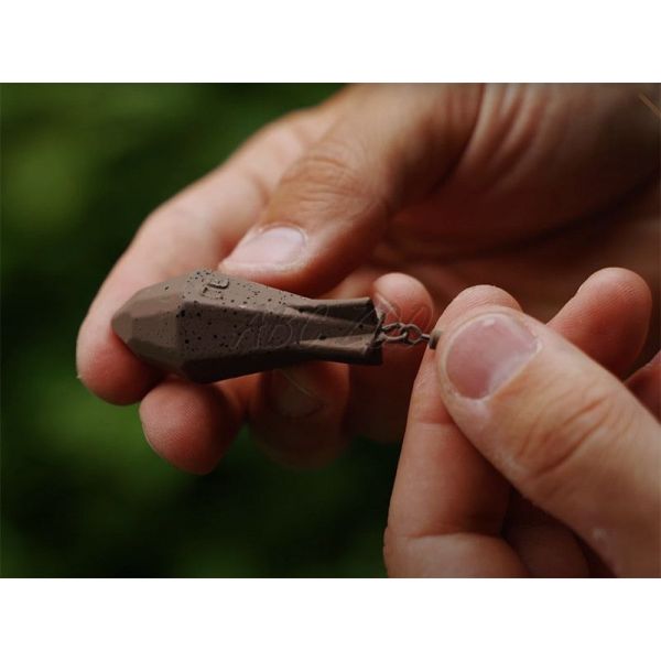 Povrch zátěže má přírodní hnědé odstíny s černými skvrnami, které ji dokonale maskují na dně. Zvětšené očko na obratlíku umožňuje rychlé a snadné upevnění k montáži.