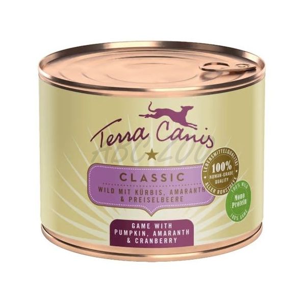 Konzervy Terra Canis z řady CLASSIC obsahují vysoký podíl masa a čerstvé zeleniny, ovoce a bylinek. Na živiny bohaté, lehké, bezlepkové pseudoobiloviny (např. proso, amarant, přírodní rýže) jsou přidávány ve velmi malém množství, které je pro psa snadno stravitelné (4-10 %). Přírodní složky (mořské řasy, minerální jíl, květový pyl, šípky, andská sůl, pivovarské kvasnice) dodávají důležité vitamíny, minerály a stopové prvky. Řepkový olej dodává cenné esenciální mastné kyseliny. Všechny suroviny jsou 100% potravinářské kvality.