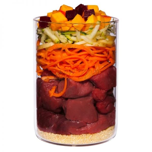 Složení: Zvěřina (47 %), brambory, mrkev, dýně (8 %), cuketa, celer, nízkotučný jogurt, červená řepa*, amarant (3 %), řepkový olej, ústřice*, pivovarské kvasnice*, brusinky* (0,6 %), bazalka*, minerální jíl*, pyl*, mořské řasy*, minerální látky