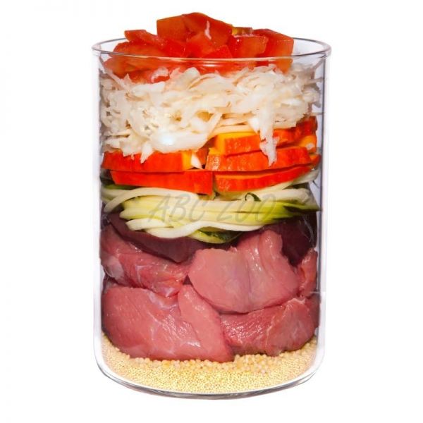 Poměr Maso : zelenina/ovoce/byliny : amarant + proso : ostatní suroviny = 56 % : 32 % : 4 + 6 % : 2 %