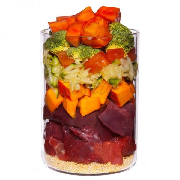 Poměr Maso : proso : zelenina/ovoce/byliny : ostatní suroviny = 55 % : 7 % : 34 % : 4 %