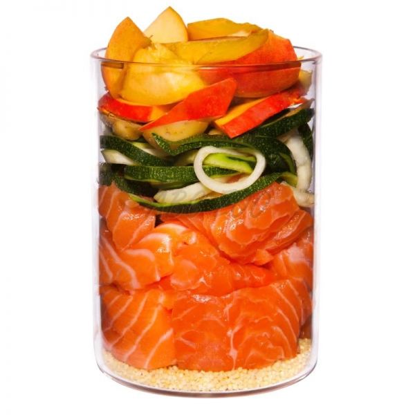 Složení: Filé z lososa (55 %), cuketa, dýně, broskev (9 %), brambory, proso (6,5 %), řepkový olej, pivovarské kvasnice*, ústřice*, rakytník*, semena fenyklu* (0,2 %), tymián* (0,2 %), kopr* (0,2 %), petržel*, mleté lněné semínko, šípky*, minerální jíl*, mořské řasy*, minerály