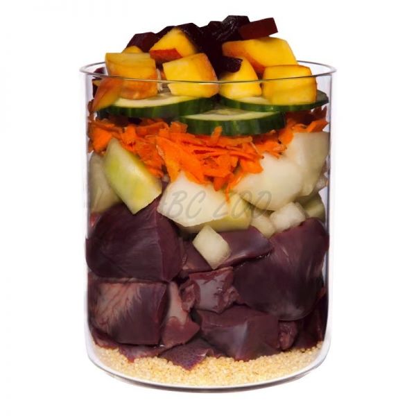 Složení: Maso z telecí srdeční svaloviny (41 %), telecí plíce (15 %), mrkev, proso (8 %), žlutý meloun (6 %), celer, okurka (5 %), červená řepa* (4 %), meruňky (3 %), řepkový olej, ústřice*, pivovarské kvasnice*, bazalka*, řeřicha*, rakytník*, andská sůl, fenyklové semínko*, minerální jíl*, šípky*, mořské řasy*, minerály