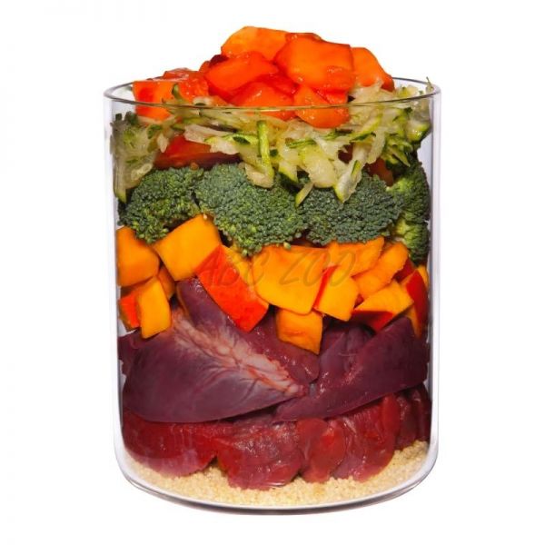 Poměr Maso : proso : zelenina/ovoce/byliny : ostatní suroviny = 55 % : 7 % : 34 % : 4 %