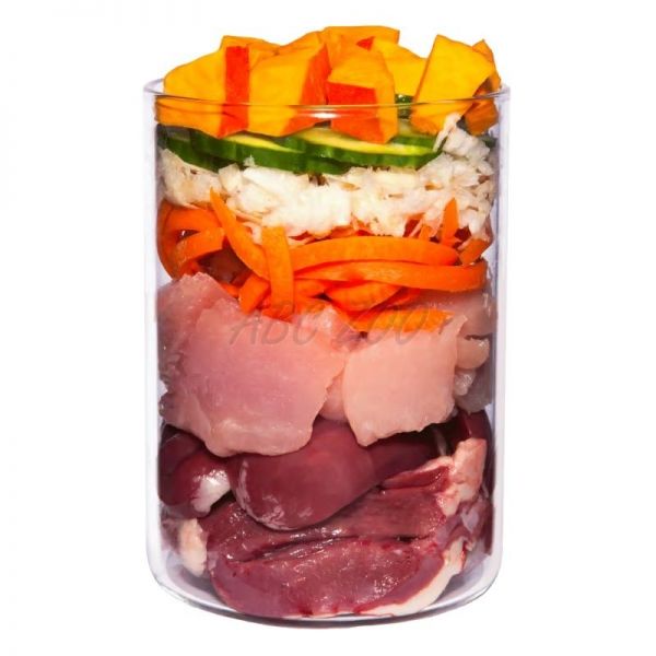 Poměr Maso : zelenina/ovoce/byliny : ostatní složky = 64 % : 33 % : 3 %