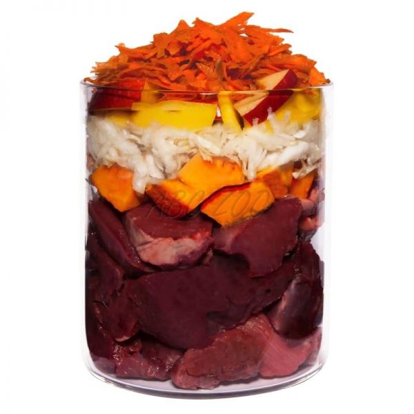 Poměr Maso : zelenina/ovoce/byliny : ostatní složky = 54 % : 42 % : 4 %