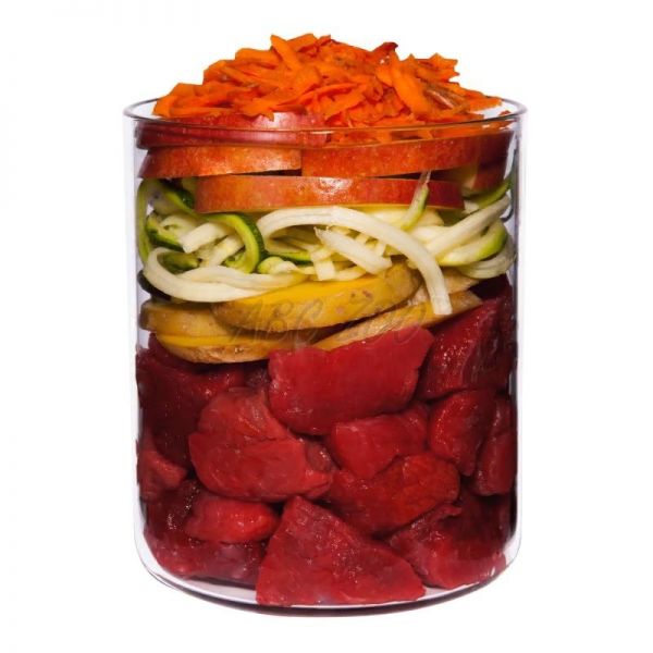 Poměr Maso : zelenina/ovoce/byliny : ostatní složky = 55 % : 42 % : 3 %