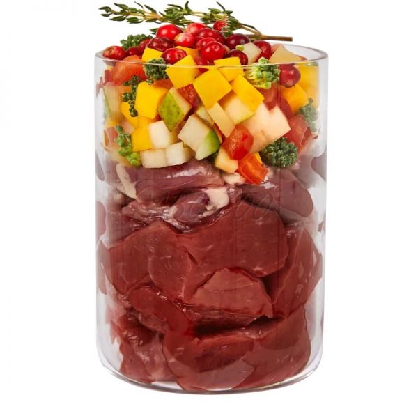 Složení: Kuřecí srdce (34 %), zvěřinová svalovina (dušené maso) (27 %), dýně (10 %), brambory (7 %), hruška (5 %), brokolice (5 %), rajčata, sladké brambory, brusinky (0,4 %), řepkový olej, kokosové vločky, pivovarské kvasnice*, ústřice*, pampeliška*, heřmánek* (0,1 %), tymián* (0,1 %), šalvěj* (0,1 %), minerální jíl*, andská sůl, mořské řasy*, minerály