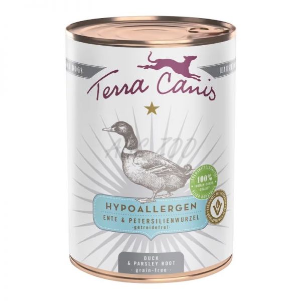 Konzervy Terra Canis z řady HYPOALLERGENIC obsahují čistou svalovinu (60 %) z jediného exotického zdroje bílkovin, doplněnou nízkoalergenní zeleninou. Všechny suroviny jsou 100% potravinářské kvality. Vhodné pro psy s potravinovými alergiemi/intolerancemi a pro zavedení eliminační diety.