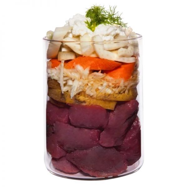 Složení: Telecí maso 47 % (telecí srdce 40 %, telecí plíce 7 %), vývar 22 %, mrkev 13 %, brambory 10 %, celer 3 %, tvaroh 2 %, fenykl, kokosová mouka*, ústřicové lastury*, heřmánek 0,4 %*, minerální jíl*, měsíček lékařský 0,2 %*, černý kmín 0,1 %*, andská sůl*, spirulina*