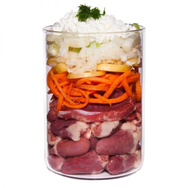 Složení: Kuře 45 % (kuřecí srdce 30 %, kuřecí žaludek 15 %), vývar 22 %, mrkev 13 %, brambory 10 %, celer 3 %, tvaroh 2 %, fenykl, kokosová mouka*, ústřicová lastura*, heřmánek 0,4 %*, minerální jíl*, měsíček lékařský 0,2 %*, černý kmín 0,1 %*, andská sůl*, spirulina*