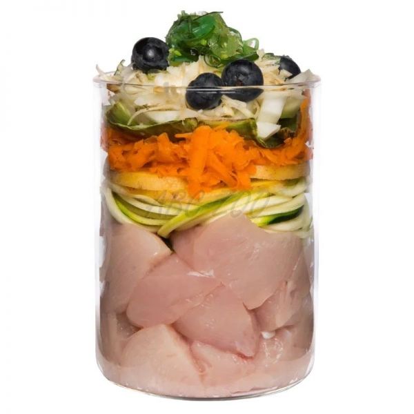 Složení: Kuře 47 % (kuřecí svalovina 36 %, kuřecí žaludek 11 %), vývar 20 %, mrkev 6 % *, cuketa 6 % *, brambory 4 % *, fenykl 3 % *, brokolice 3 % *, celer 2 % *, červená řepa 2 % *, lupinová mouka 2 % */**, borůvky 1 % *, minerály 1 % **, řepkový olej, kokosové vločky **, kokosová mouka **, listy artyčoku **, šalvěj **, pískavice řecké seno **, kmín **, tymián **, ústřicové lastury **, spirulina *