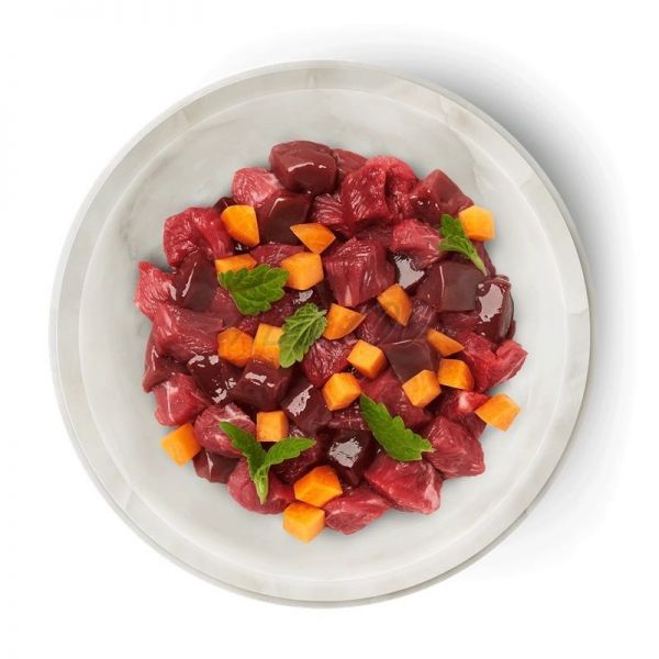 Složení: Hovězí srdce (71 %), hovězí játra, hovězí svalovina (6 %), mrkev (4 %), rajčatový prášek*, řepkový olej, rybí tuk, kočičí ocas*, minerální látky