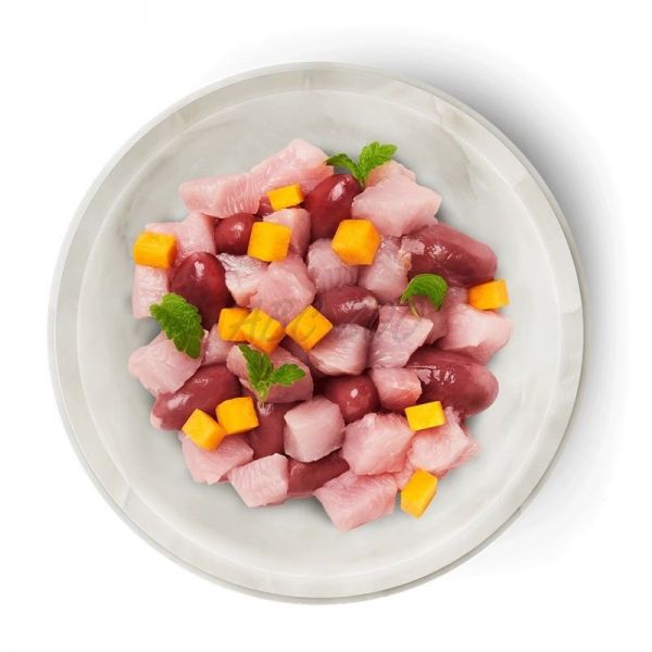 Složení: kuřecí žaludky (20 %), kuřecí kůže (20 %), kuřecí játra (15 %), kuřecí srdce (10 %), krůtí svalovina (10 %), krůtí žaludky (10 %), kuřecí svalovina (5 %), dýně (4 %), rajčatový prášek*, řepkový olej, rybí tuk, catnip*, minerální látky