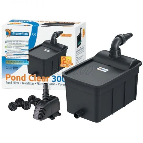 SuperFish Pond Clear kit 3000 je vysoce efektivní filtrační systém, který se skládá z filtru s UV-C lampou zabudovanou do horního krytu a čerpadla. Je navržen pro jezírka s objemem do 3000 litrů (u jezírek bez ryb). Tento kompaktní a výkonný set kombinuje mechanickou, biologickou a UV filtraci, čímž zajišťuje křišťálově čistou vodu a zdravé prostředí pro ryby a rostliny.