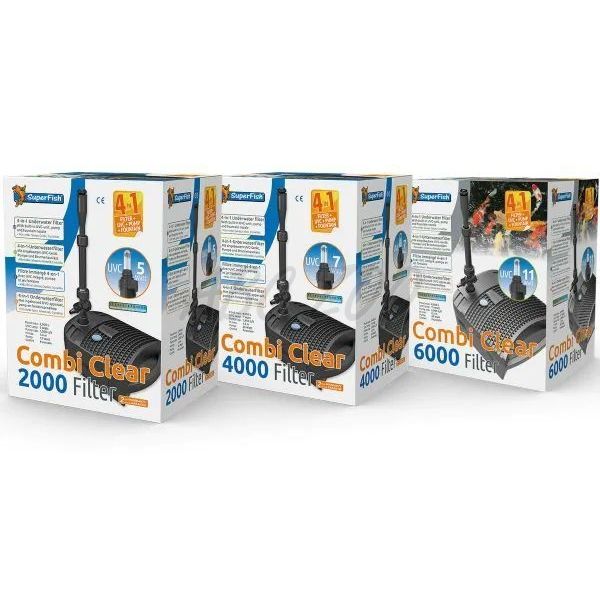 SuperFish Combi Clear 6000 je kompletní systém 4 v 1, který kombinuje filtr, čerpadlo, UV-C lampu a fontánku v jednom kompaktním zařízení. Určený pro jezírka do 6000 litrů (bez ryb) nebo 3000 litrů (s mírným zarybněním). Instaluje se zcela pod vodu, čímž nenarušuje vzhled jezírka, a nevyžaduje hadice – stačí zapojit do zásuvky.