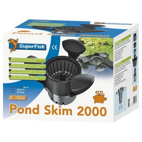 SuperFish Pond Skim 2000 je výkonný plovoucí skimmer pro jezírka o rozloze do 25 m², který efektivně odstraňuje nečistoty z hladiny, jako jsou listí, prach, pyl a řasy. Zabudované čerpadlo s průtokem 2 000 l/h neustále nasává vodu, přičemž plovoucí mechanismus se automaticky přizpůsobuje výšce hladiny.