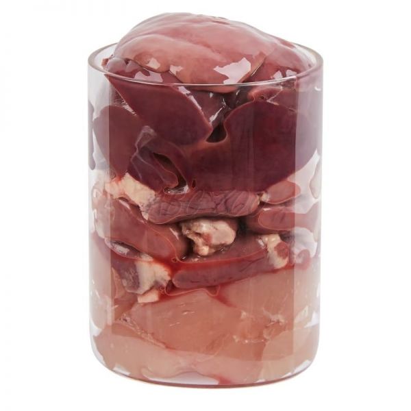 Složení: kuřecí srdce (50 %), kuřecí žaludek (32 %), kuřecí játra (8 %), kuřecí svalovina (7 %), ústřice*, minerální jíl*, pivovarské kvasnice*, řepkový olej, mořské řasy*