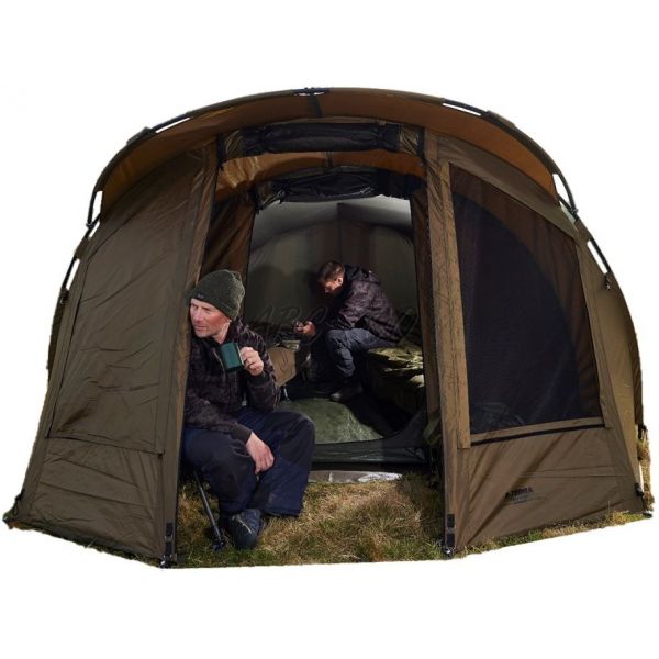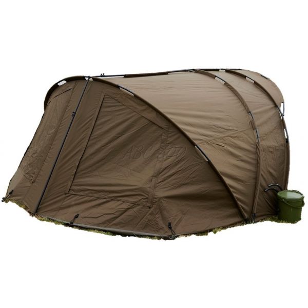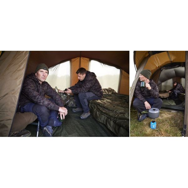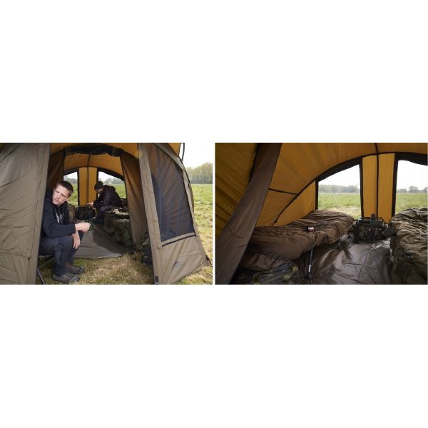 Velký bivak pro dva rybáře a dvě lehátka s prostornou předsíňkou a kšiltem proti dešti a slunci.