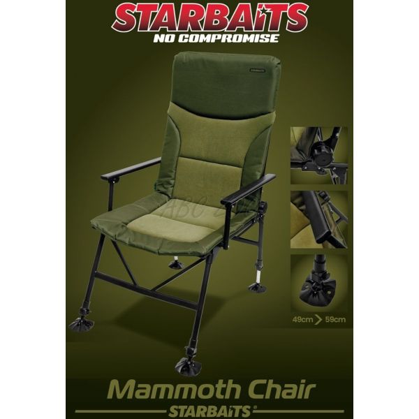 Křeslo Mammoth je křesílko nové generace nejvyšší kvality, funkčnosti a maximálního pohodlí. Speciální hliníková konstrukce se vyznačuje vysokou pevností a nízkou hmotností. Bohatě polstrovaný matrac je vyroben z mimořádně pohodlné ergonomicky tvarované tkaniny (nylon 600D) v kombinaci s hřejivým polar fleecem. Perfektní izolace chrání tělo před chladem od země. Povrchová úprava zajišťuje dlouhou životnost a snadné čištění. Nastavitelné nohy se širokými patkami proti zapadání umožňují pohodlné usazení i v nerovném terénu. Široké opěrky rukou přispívají k ještě vyššímu komfortu při sezení. V horní části opěradla je integrované zesílené polstrování jako opěrka hlavy. Polohu opěradla lze nastavit pomocí pevného kloubu.