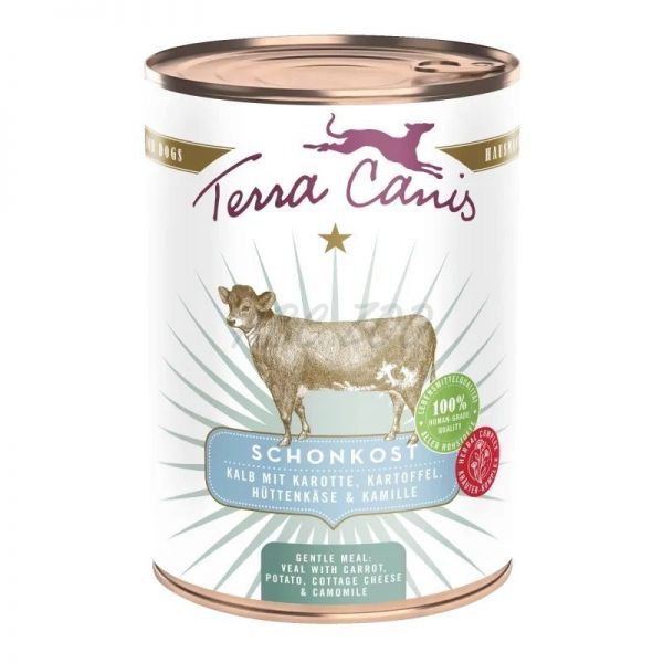 Konzervy Terra Canis z řady GENTLE MEAL jsou speciální dietní menu bez obilovin založené na lehce stravitelných surovinách, které podporují celý trávicí trakt. Libové telecí nebo kuřecí maso v kombinaci s bramborami, mrkví, fenyklem, probiotickým tvarohem a také kokosovou moučkou. Recepturu doplňují zdravé bylinky, jako je heřmánek, meduňka, měsíček, minerální jíl a olej z černého kmínu. Vyvinuto ve spolupráci s veterinární lékařkou Hannou Stephan. Všechny ingredience jsou 100% potravinářské kvality.