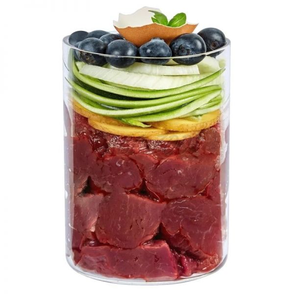 Složení: Konská svalovina (56 %), mrkev, brambory, cuketa (7 %), brokolice (4 %), celer, celulóza, jahody (2 %), borůvky, řepkový olej, MCT olej, minerální látky, kokosová moučka (1 %), heřmánek* (0,4 %), minerální jíl*, Emiko® EM mix (0,25 %), šalvěj*, psylliové lusky*, lněné semínko, kmín*, řebříček*, meduňka*, anýz*, andská sůl, mořské řasy*, ústřice*