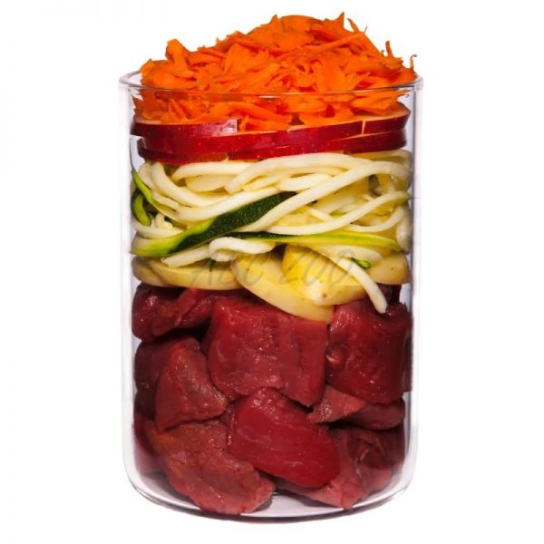 Poměr Maso : zelenina/ovoce/byliny : ostatní složky = 55 % : 42 % : 3 %