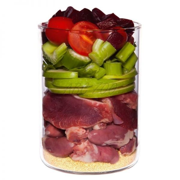 Poměr Maso : zelenina/ovoce/byliny : amarant + proso : ostatní suroviny = 55 % : 33 % : 5 % + 5 % : 2 %