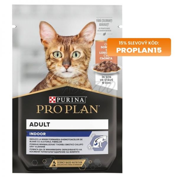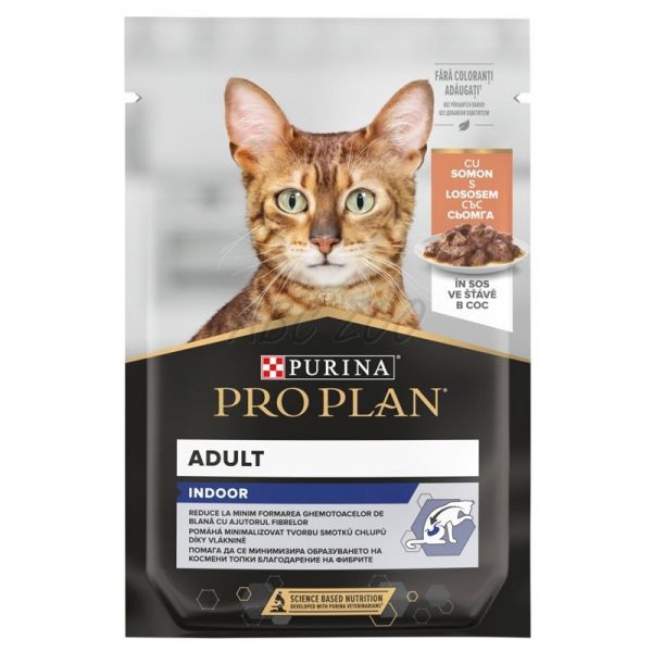 PURINA® PRO PLAN® Kompletní krmivo pro dospělé kočky žijící převážně v bytě, s lososem ve šťávě. Pomáhá minimalizovat tvorbu chomáčků chlupů díky vláknině a napomáhá podporovat štíhlou linii a optimální tělesnou kondici.