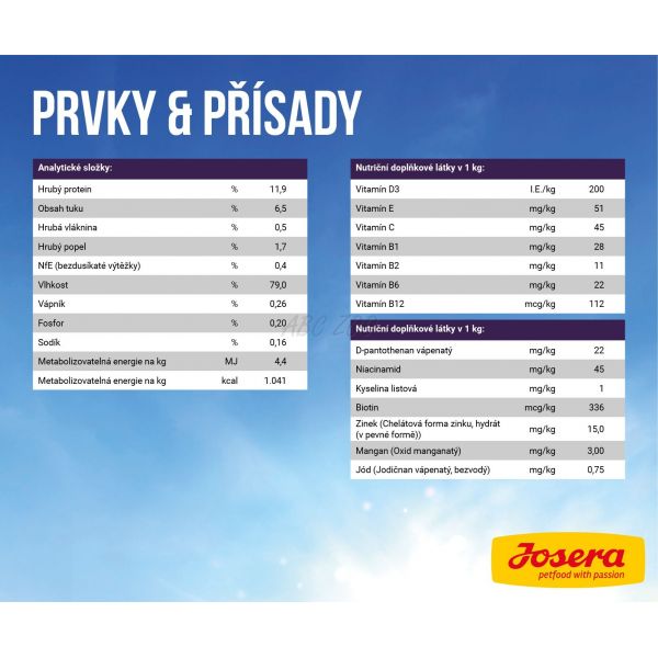 Složení: krůtí maso (maso, žaludek, játra, srdce, krky) 68 %, vývar 31 %, minerální látky 1 %