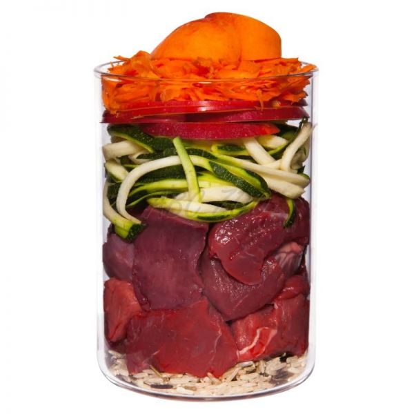 Složení: Hovězí srdeční svalovina (30 %), cuketa, mrkev (12 %), hovězí plíce (11 %), jablko (9 %), hovězí játra (7 %), rýže natural (6 %), hovězí svalovina (4 %),5 %), meruňky, řepkový olej, ústřice*, pivovarské kvasnice*, bazalka*, fenyklové semínko, petržel*, šípkový prášek*, minerální jíl* mořské řasy*, minerály