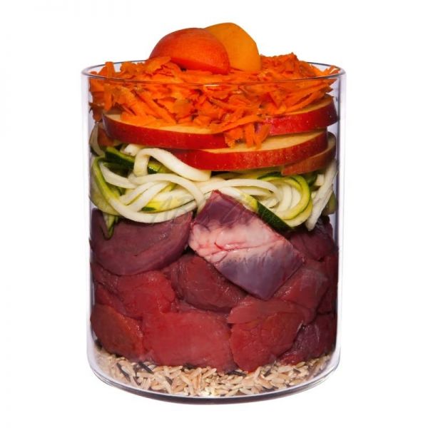 Složení: Hovězí srdeční svalovina (30 %), cuketa, mrkev (12 %), hovězí plíce (11 %), jablko (9 %), hovězí játra (7 %), rýže natural (6 %), hovězí svalovina (4 %),5 %), meruňky, řepkový olej, ústřice*, pivovarské kvasnice*, bazalka*, fenyklové semínko, petržel*, šípkový prášek*, minerální jíl* mořské řasy*, minerály